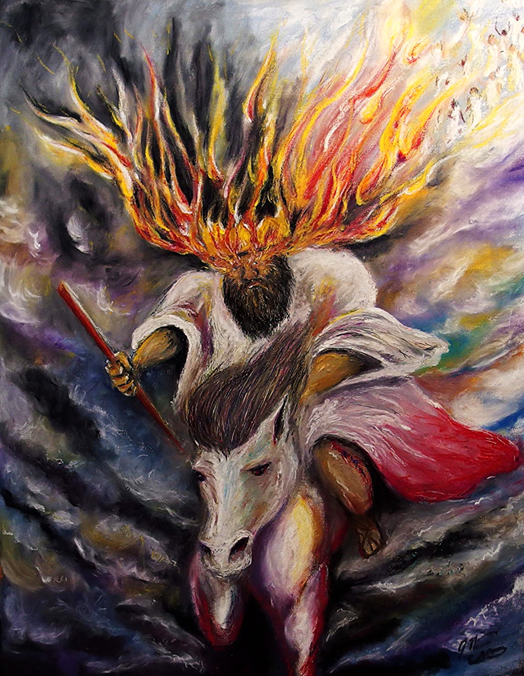- The fire is shooting from His eyes but the eyes are soft and looking at the viewer. I wanted to depict judgement coming alongside a plea to repent. Jesus is not harsh, He is just. There is a difference.